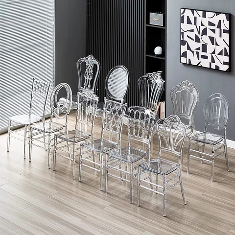 เก้าอี้อะคริลิคใสใสแบบวางซ้อนได้ทำจากเรซิน Chiavari แบบนอร์ดิกสำหรับงานแต่งงาน